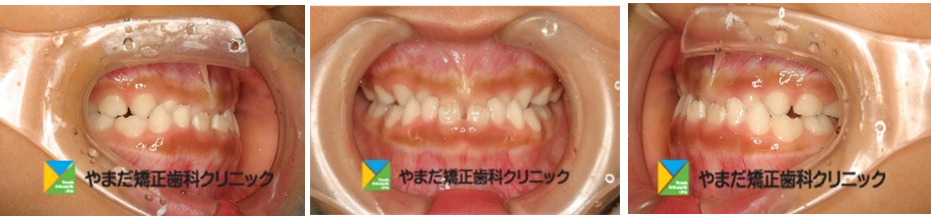 機能的矯正装置を用いて前歯反対咬合の改善を行った後、上顎前方牽引装置を用いて上顎骨の前方成長を促進する。身長の伸びが停止して上下顎マルチブラケット装置を用いて永久歯列の整列、咬合の確立を行う。
