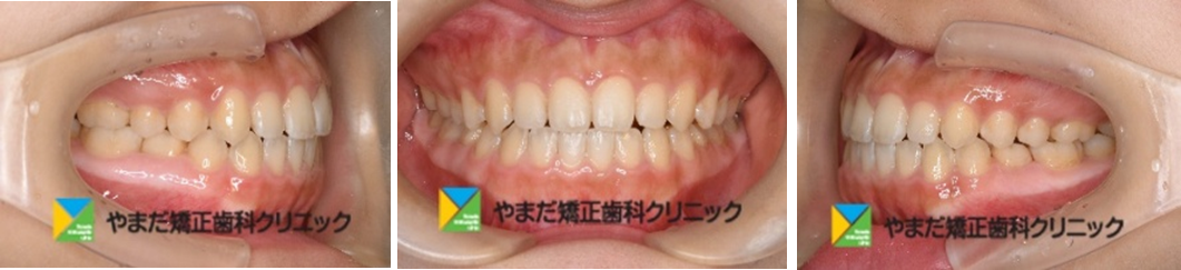 上下顎叢生が認められ、上顎歯列正中は約3mm左方偏位し上顎左犬歯唇側転位前歯(いわゆる八重歯)が認められました。上下顎大臼歯関係はⅡ級でした。